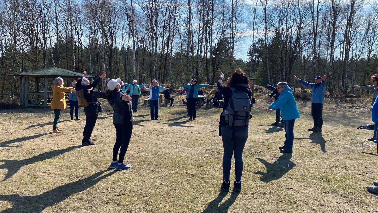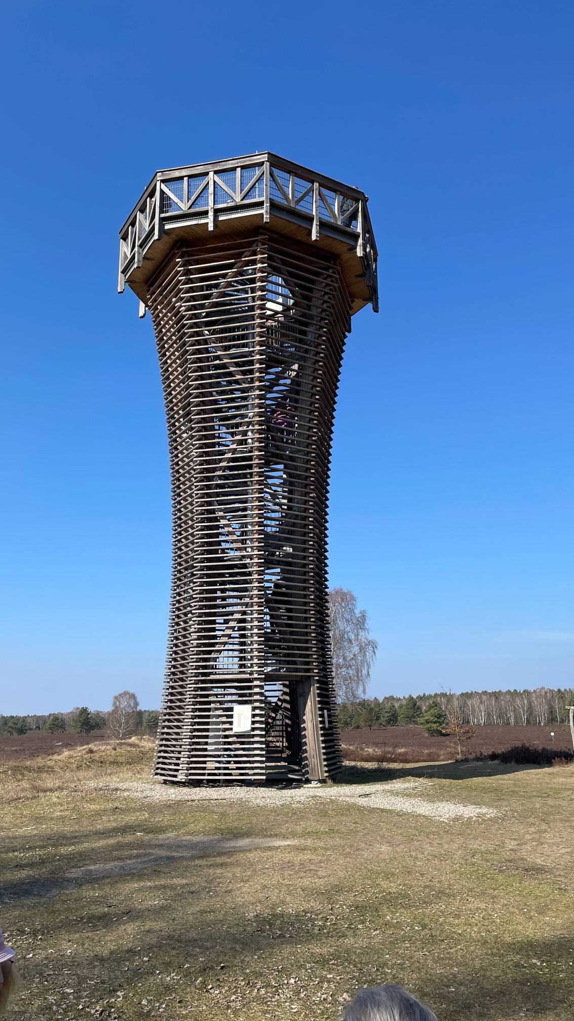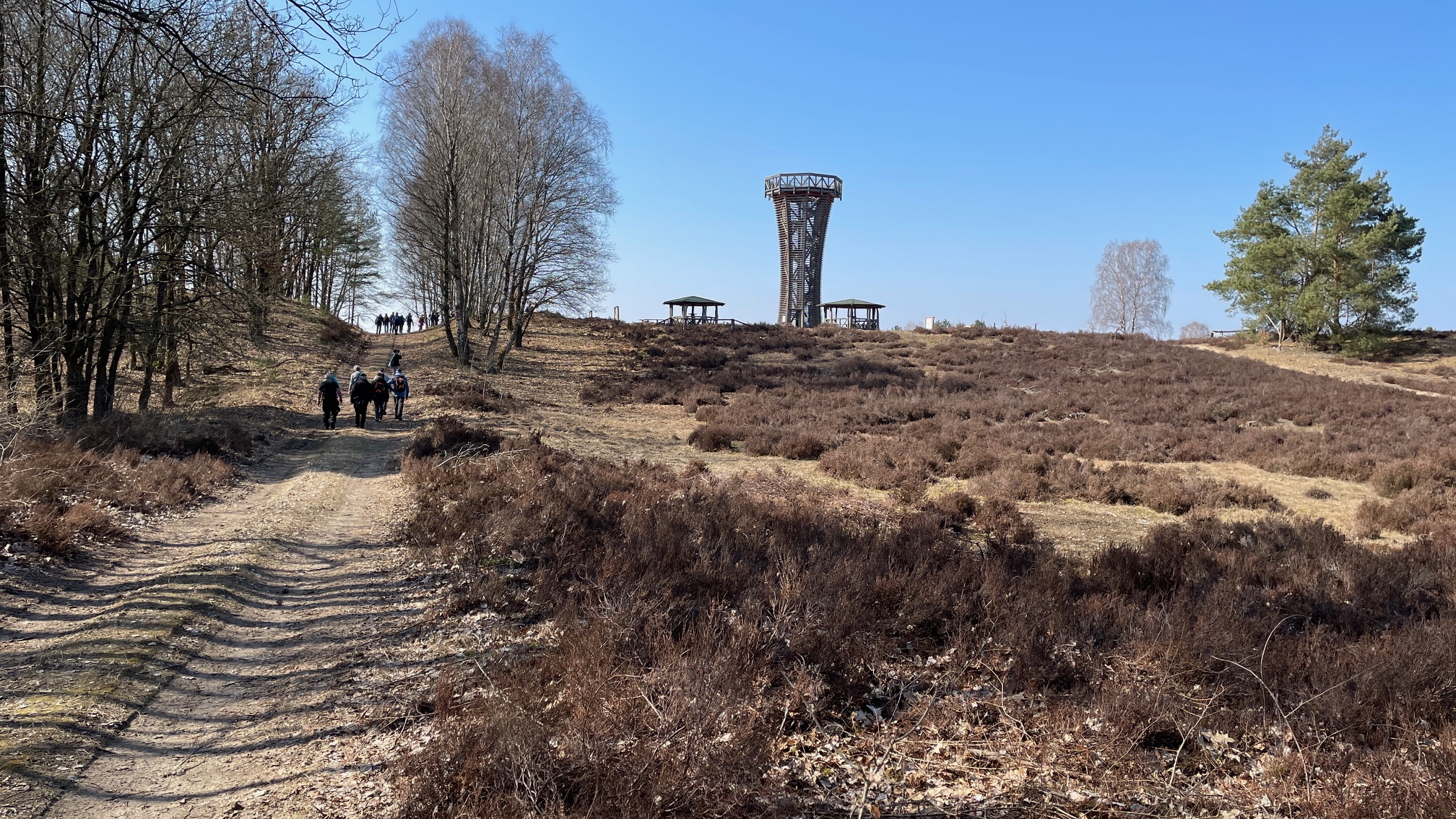 In der dritten Woche zog es uns von Pfalzheim aus startend in die beeindruckende Kyritz-Ruppiner Heide. Sylvia Schmidt hatte nicht nur die Route geplant, sondern auch den Besuch eines kleinen Kirchleins ermöglicht. Ein besonderes Highlight war anschließend der Aufstieg auf den Sielmannturm – das Wahrzeichen der „Freien Heide“. Der weite Blick über die Landschaft machte einmal mehr deutlich, welch wertvolles Naturgebiet hier durch das Engagement vieler Menschen bewahrt werden konnte. Eine kleine sportliche Einheit zwischendurch sorgte zudem für zusätzliche Energie und gute Laune. Ein kleiner Abstecher zur Temnitzquelle rundete die Wanderung ab.