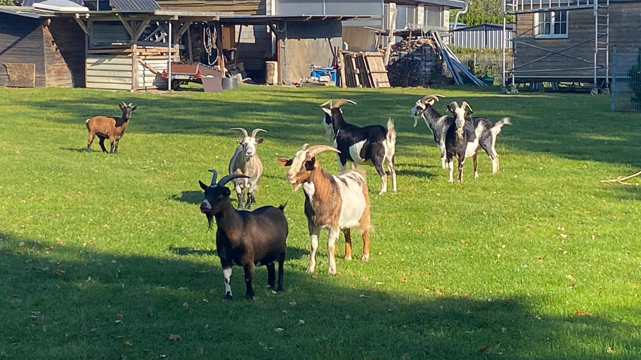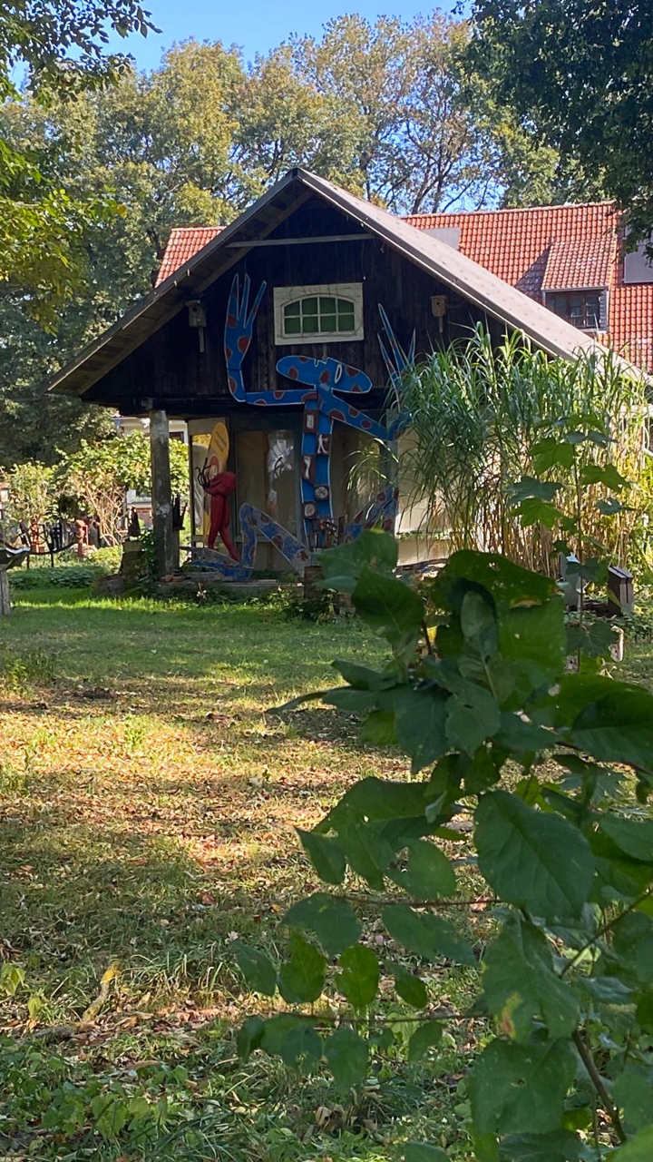 An der „Kastanie“ trafen wir uns mit den Co- Wanderleiterinnen um Ute Belik und starteten den Weg an interessierten Ziegen vorbei zum Standort der früheren Mühle von Karwe. Durch weite Felder und Wiesen ging es in Richtung alte Schäferei, wo der Schöpfer des Neuruppiner Parzival Matthias Zagon Hohl-Stein einen kleinen Skulpturengarten erschuf.