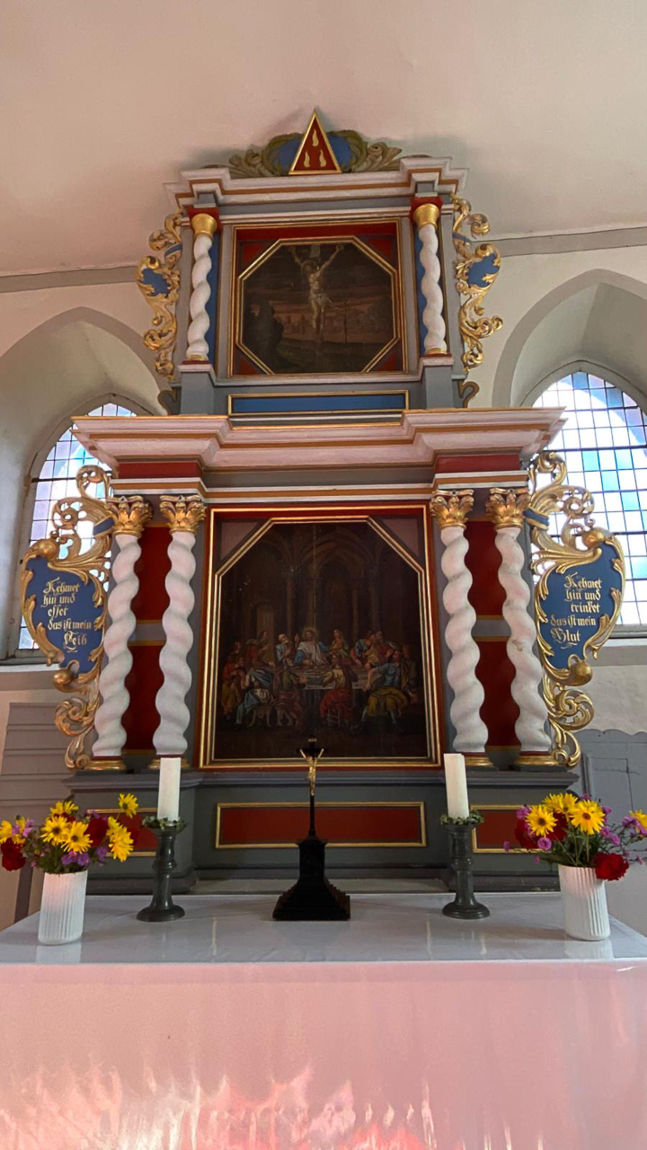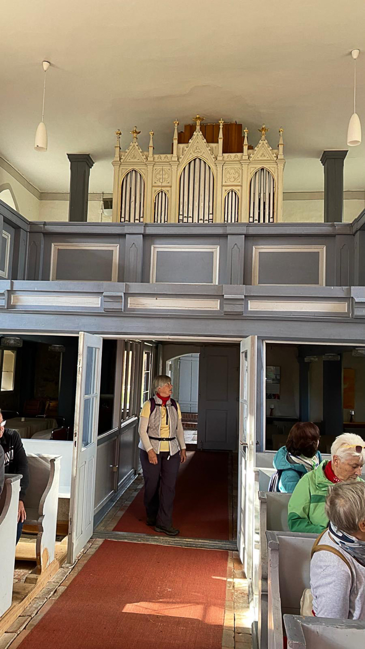 Im Dörfchen Lichtenberg empfing uns der Dorfchronist mit Frau Franke um uns einige Worte zur Dorfkirche aus dem 14. Jahrhundert zu erzählen. An der Kirche bekamen wir die vom oben erwähnten Künstler geschaffene drehbare Sonnen-Kirchenbank vorgeführt.