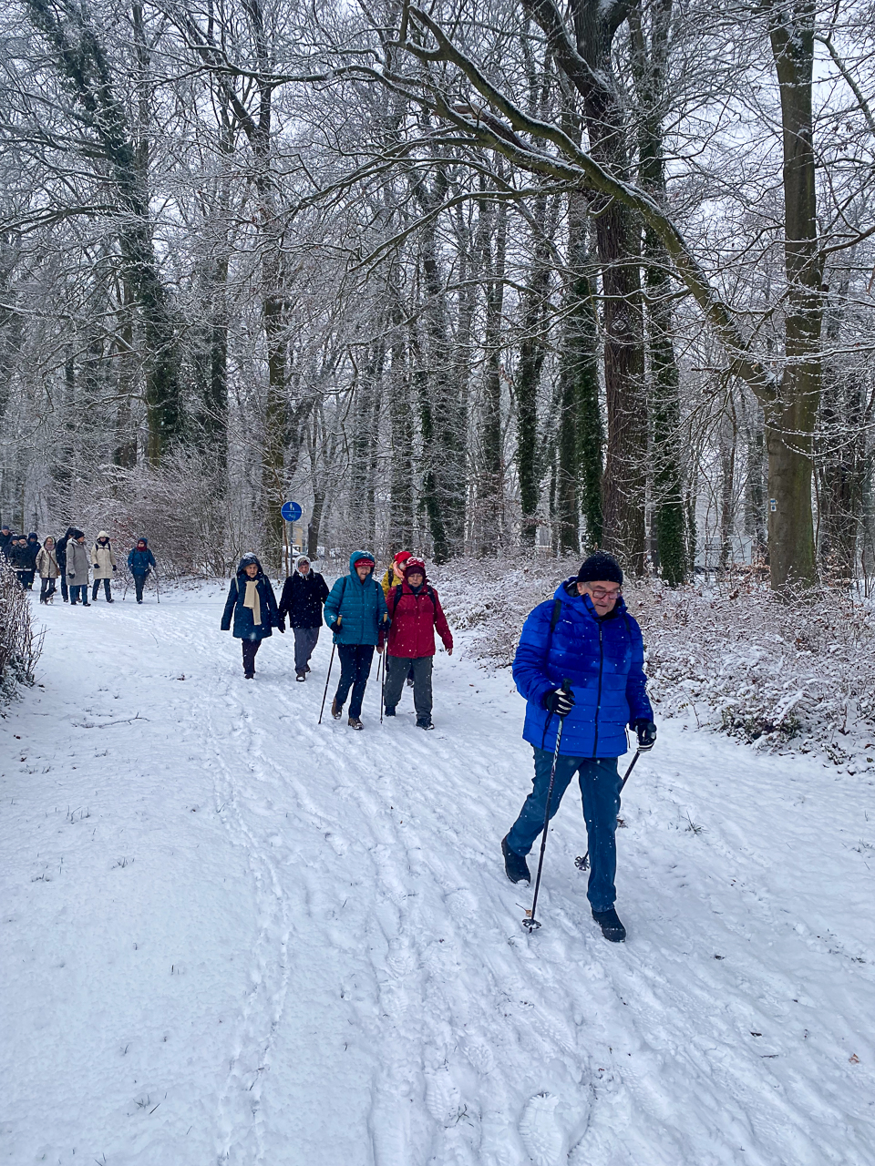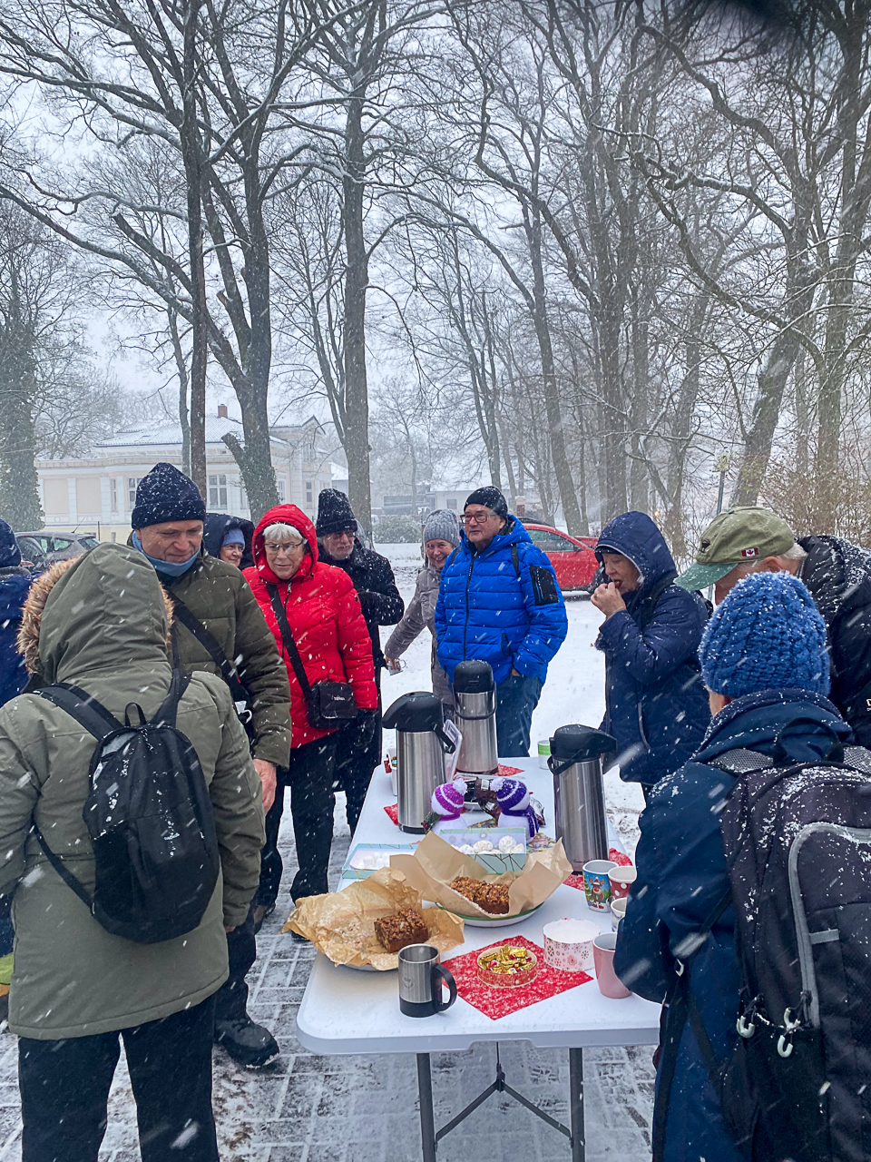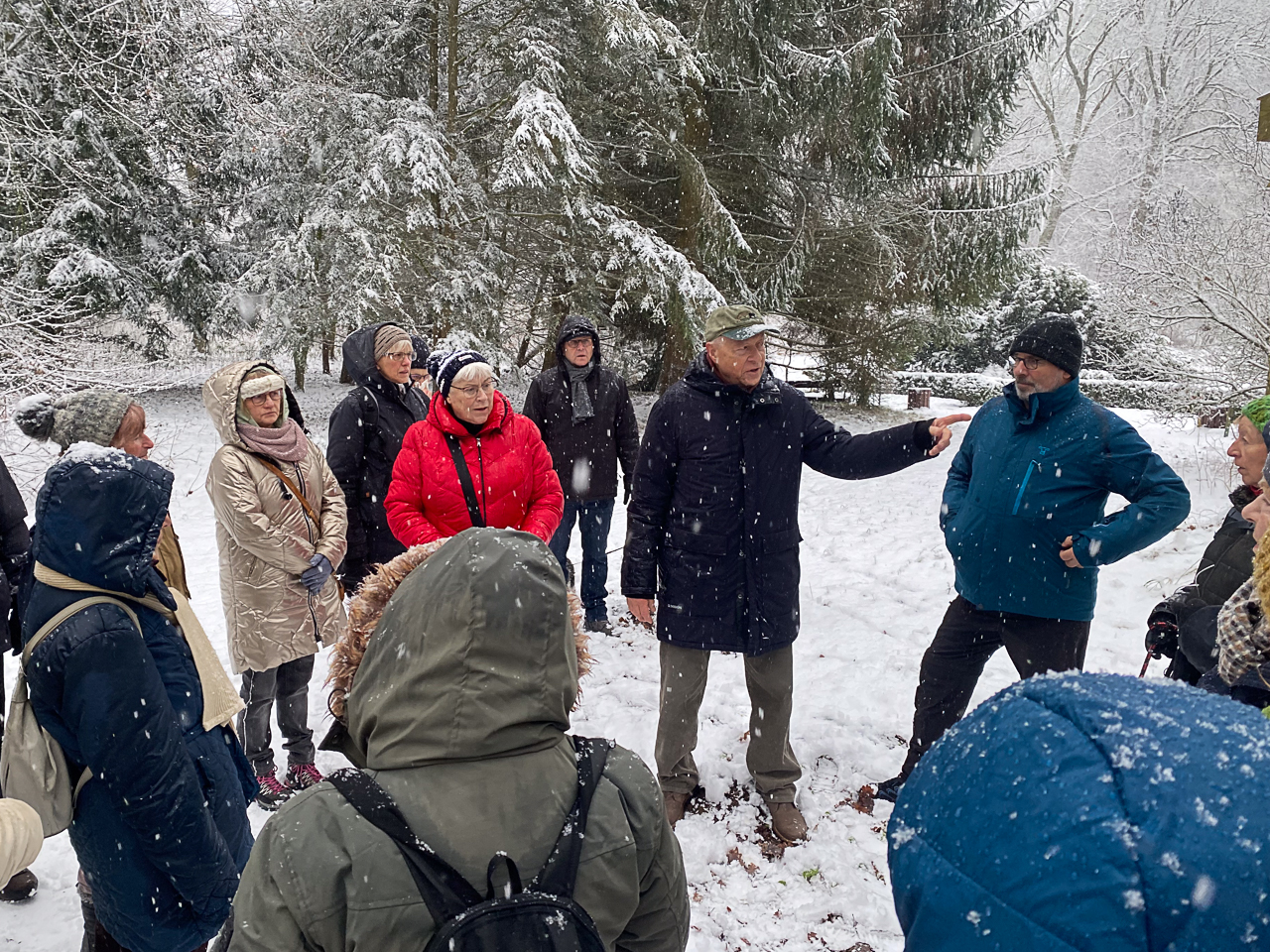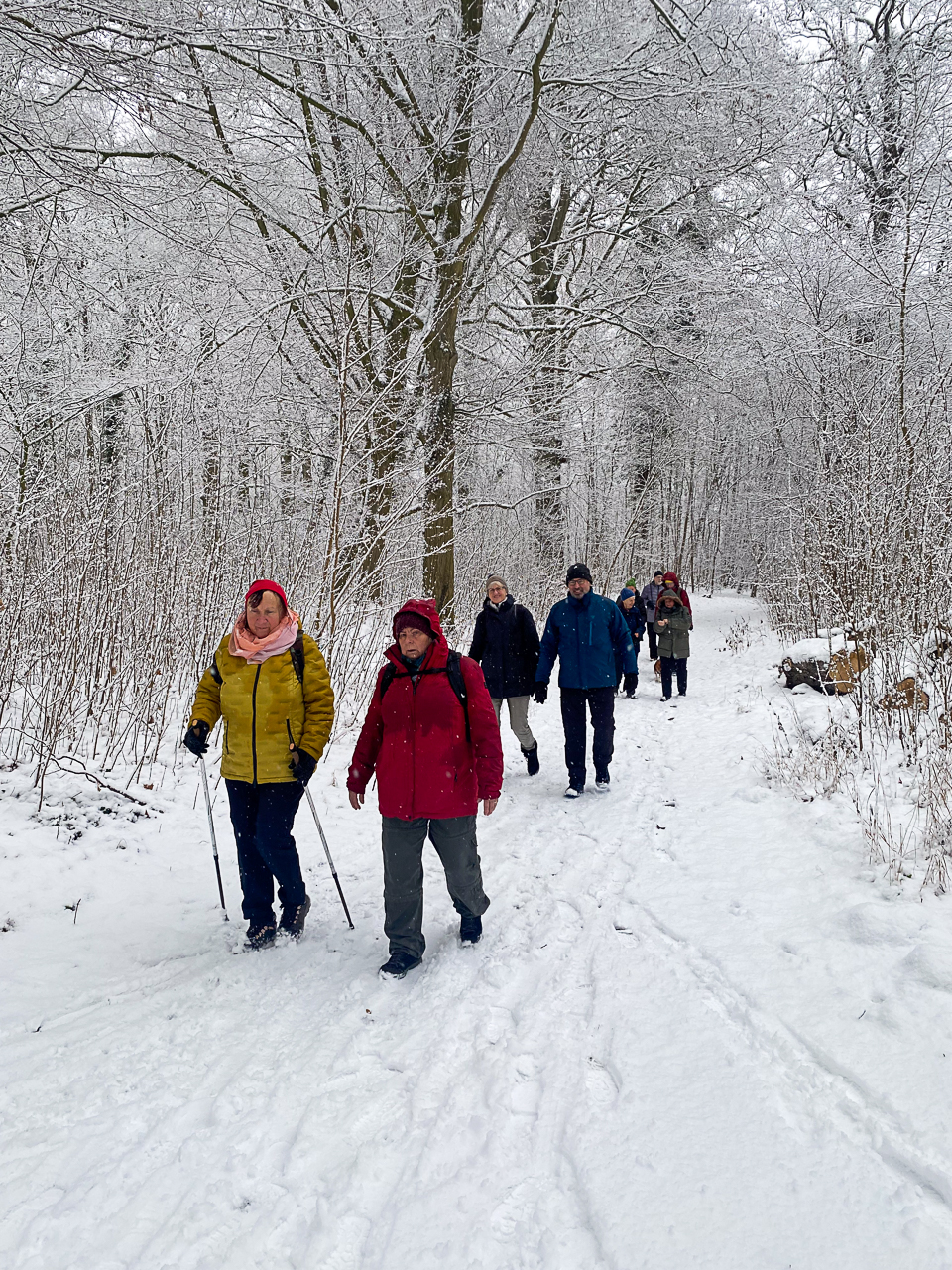 Treffpunkt war der Schlossgarten, wo die Teilnehmenden bereits mit Glühwein, selbstgemachtem Früchtebrot und weiteren Leckereien herzlich empfangen wurden. In geselliger Runde kamen Vereinsmitglieder und Gäste zusammen, um sich aufzuwärmen und auf die bevorstehende Wanderung einzustimmen. Insgesamt nahmen knapp 40 Wanderinnen und Wanderer teil – eine tolle Beteiligung!