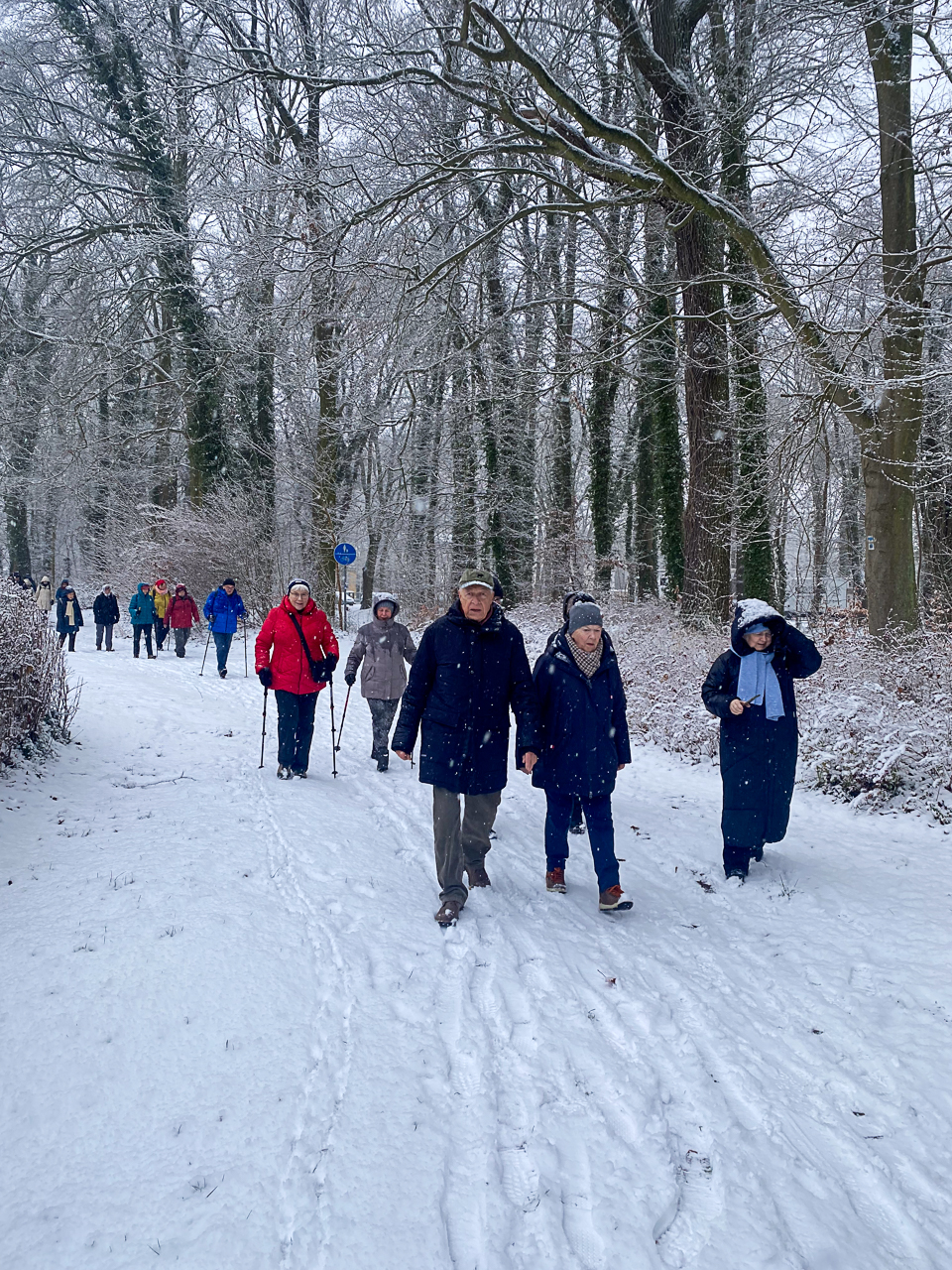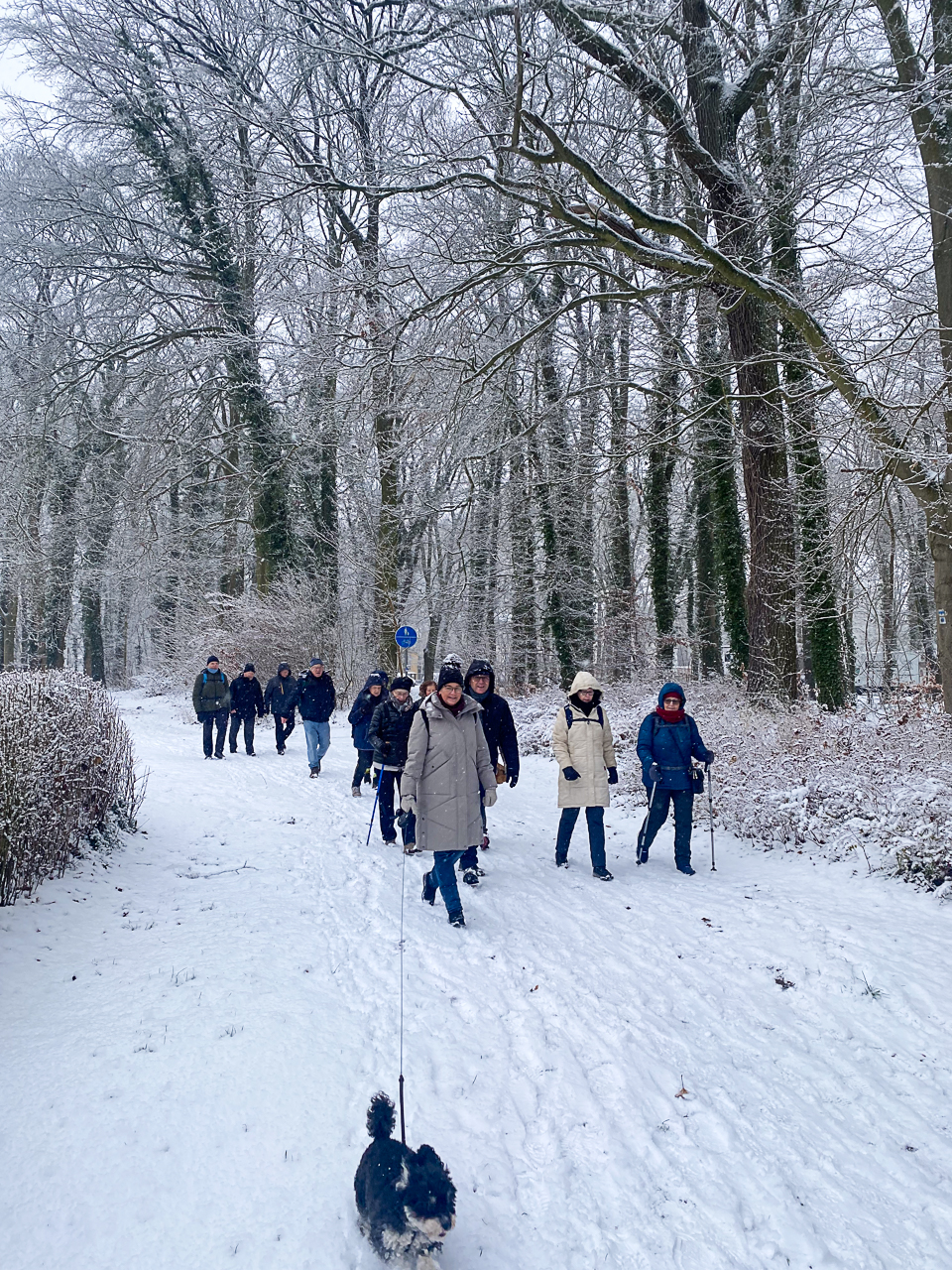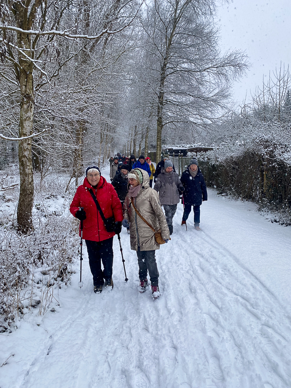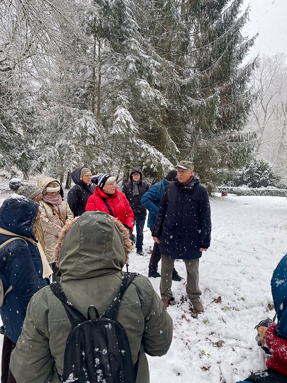 Treffpunkt war der Schlossgarten, wo die Teilnehmenden bereits mit Glühwein, selbstgemachtem Früchtebrot und weiteren Leckereien herzlich empfangen wurden. In geselliger Runde kamen Vereinsmitglieder und Gäste zusammen, um sich aufzuwärmen und auf die bevorstehende Wanderung einzustimmen. Insgesamt nahmen knapp 40 Wanderinnen und Wanderer teil – eine tolle Beteiligung!