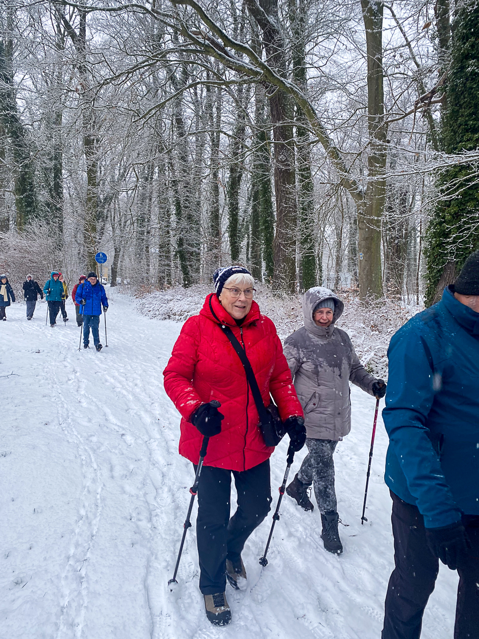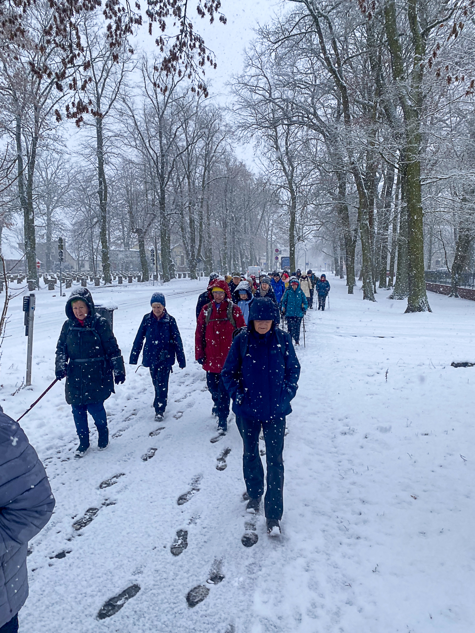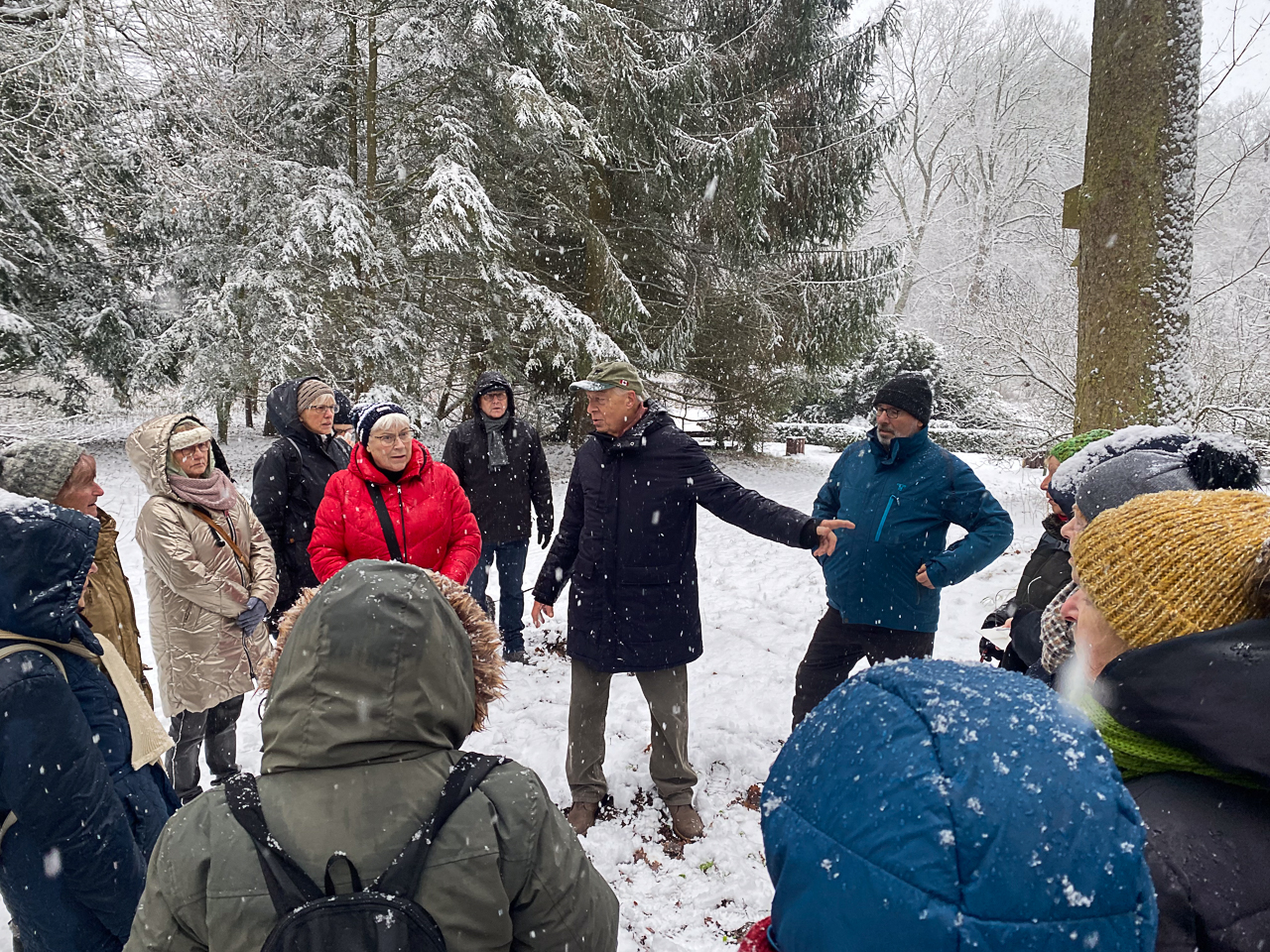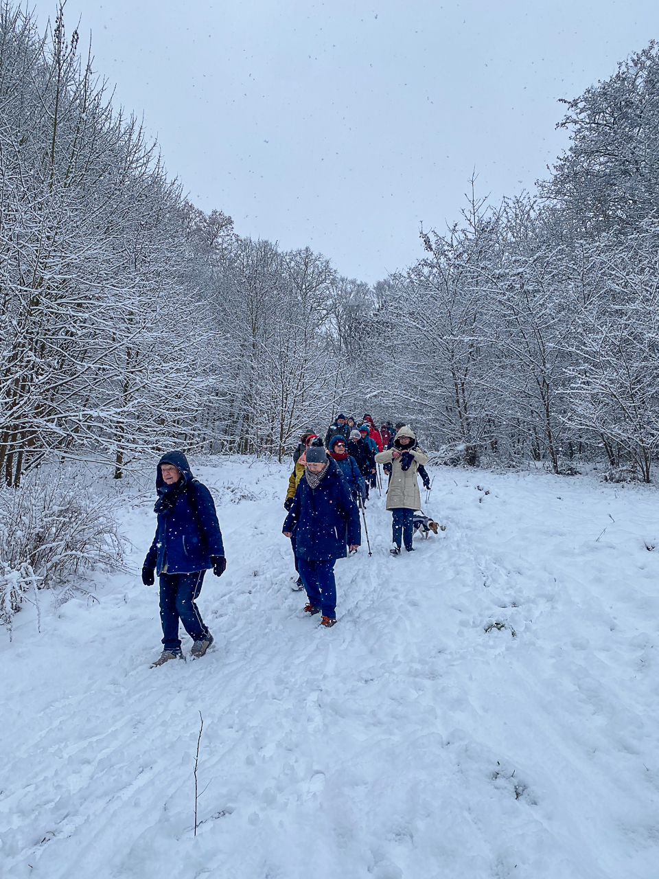 Treffpunkt war der Schlossgarten, wo die Teilnehmenden bereits mit Glühwein, selbstgemachtem Früchtebrot und weiteren Leckereien herzlich empfangen wurden. In geselliger Runde kamen Vereinsmitglieder und Gäste zusammen, um sich aufzuwärmen und auf die bevorstehende Wanderung einzustimmen. Insgesamt nahmen knapp 40 Wanderinnen und Wanderer teil – eine tolle Beteiligung!