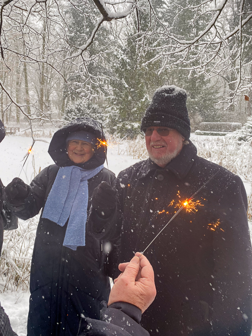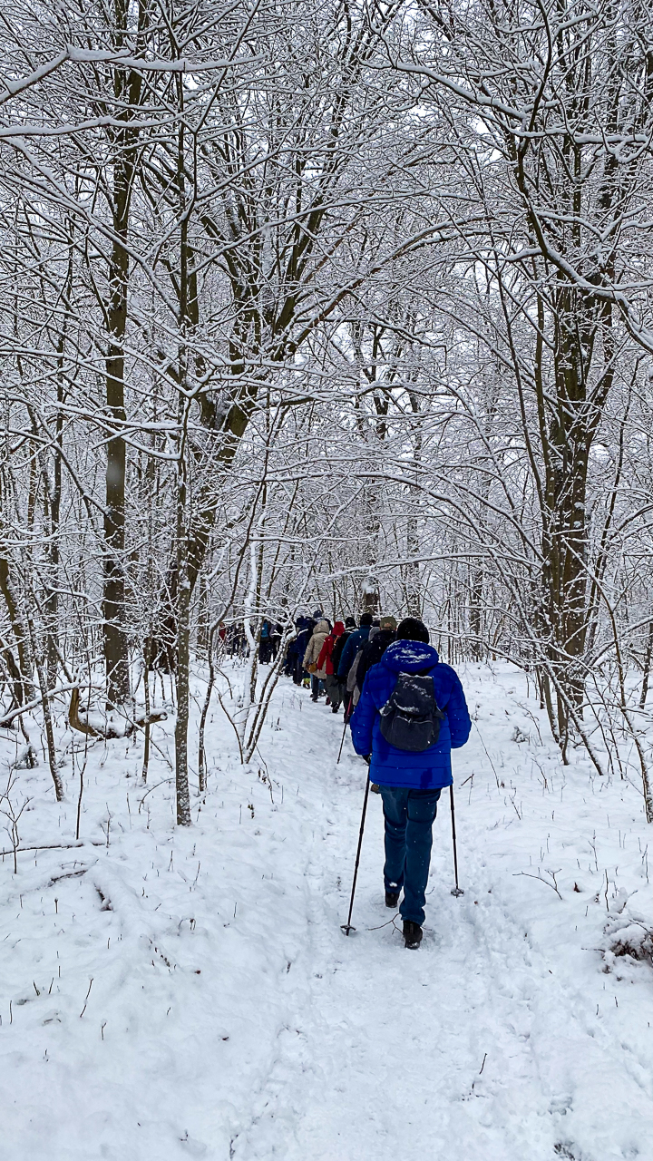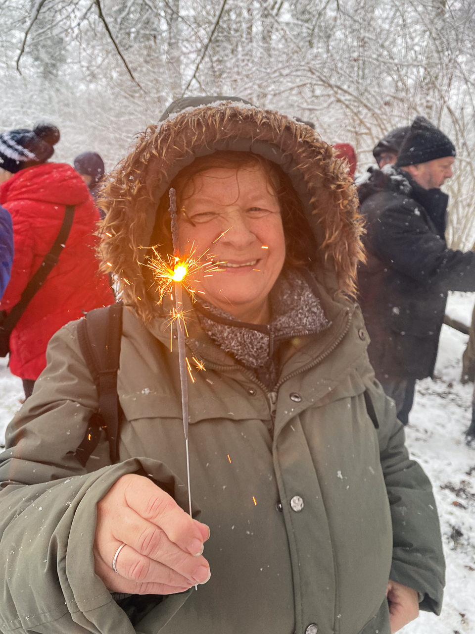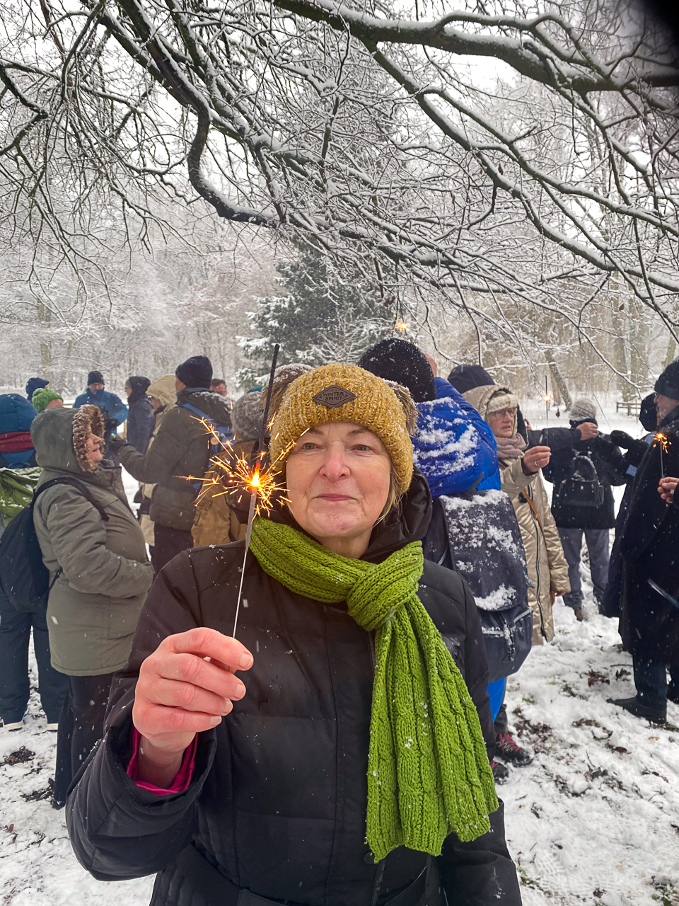 Nach diesem informativen Stopp sorgten Wunderkerzen für leuchtende Augen und eine ganz besondere Stimmung, bevor wir unsere Wanderung fortsetzten. Ein weiteres Highlight war das gemeinsame Gruppenfoto am „Eierberg“ mit einem wunderschönen Blick auf den winterlichen Ruppiner See – ein Moment, der sicher vielen in Erinnerung bleiben wird.