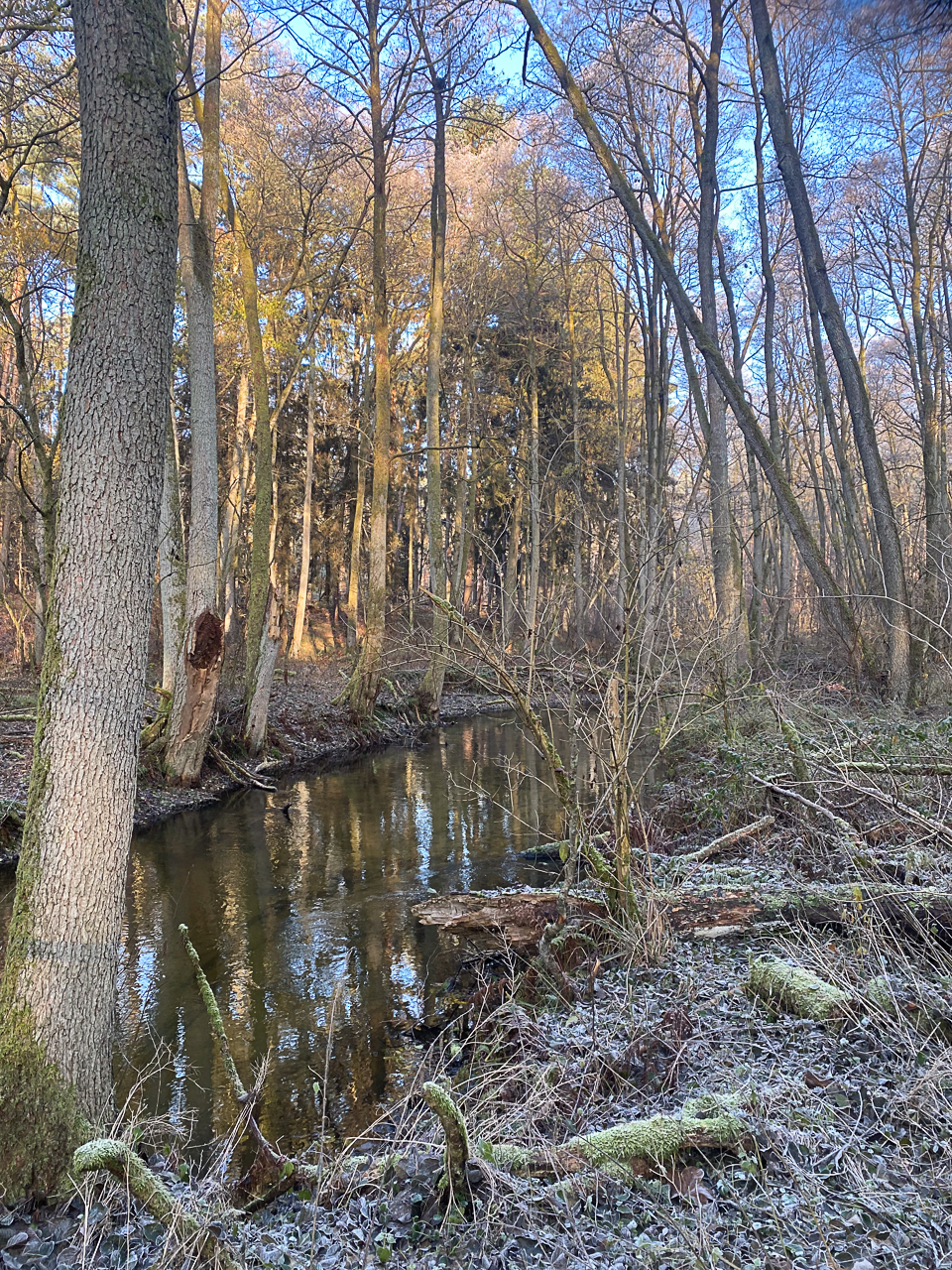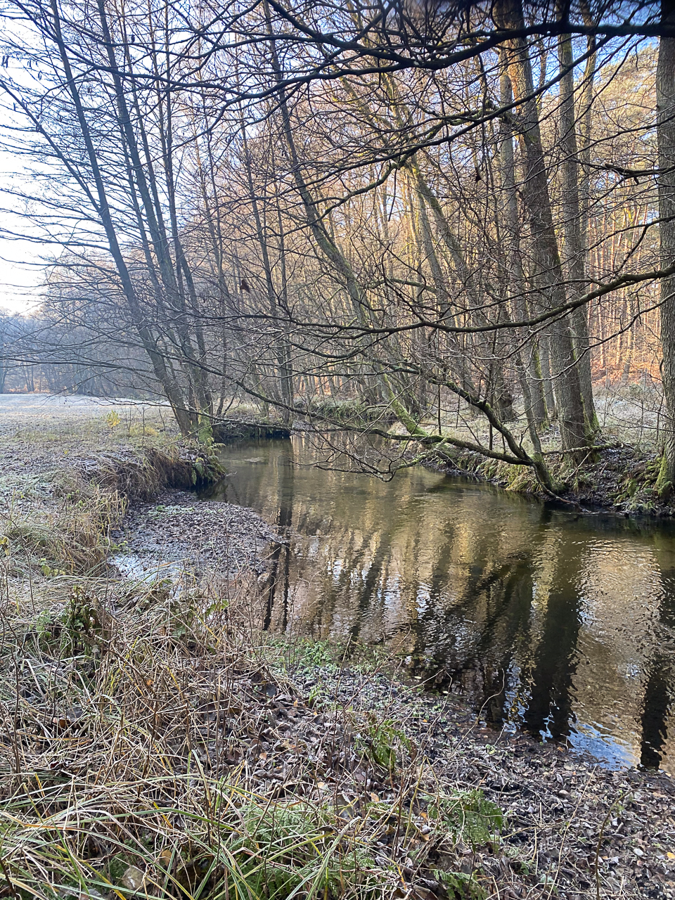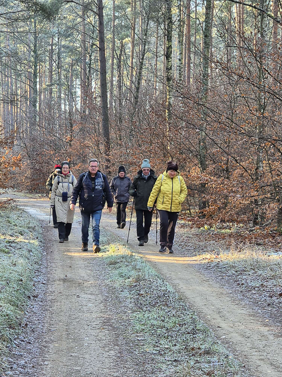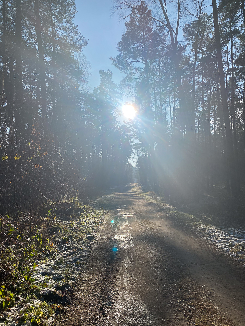 Bei strahlendem Sonnenschein und kaltem Wetter lag ein feiner Frost über Wiesen, Wegen und Bäumen. Die Natur war zart weiß gefärbt, als hätte sie sich ein leichtes Winterkleid übergezogen. Jeder Schritt durch die frostige Landschaft knirschte leise unter den Füßen und verlieh der Tour eine ganz besondere Atmosphäre.