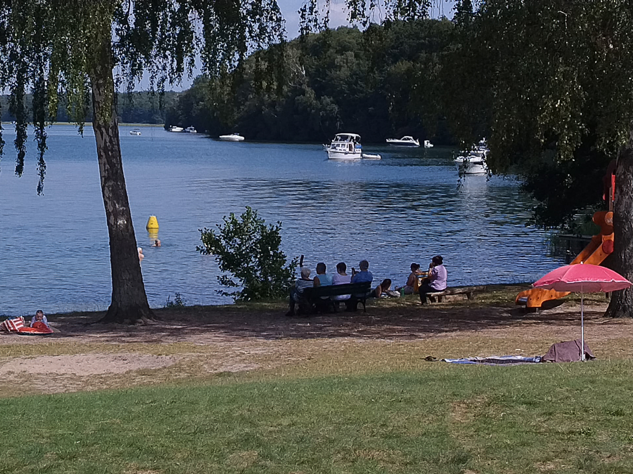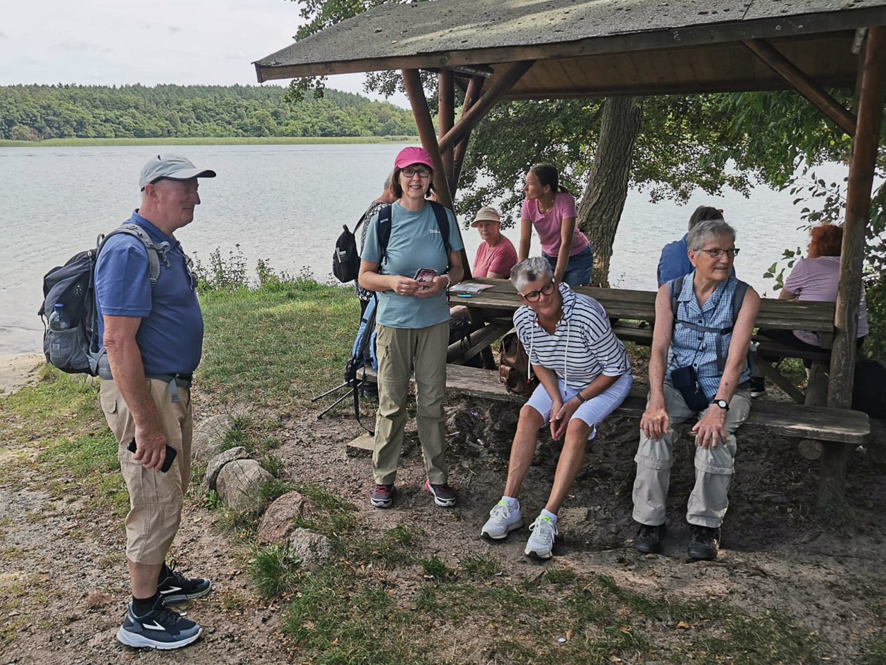 Danach waren es nur noch 2 km bis zur Badewiese Kirschallee. Die Erfrischungspause inkl. Sprung ins Wasser tat uns allen gut. Nach der letzten Etappe trafen sich einige in der Fischerhütte in Flecken Zechlin zum Essen – der Abschluss einer schönen, ca. 13 km langen, Wanderung durch unsere schöne Umgebung bei bestem Wetter.