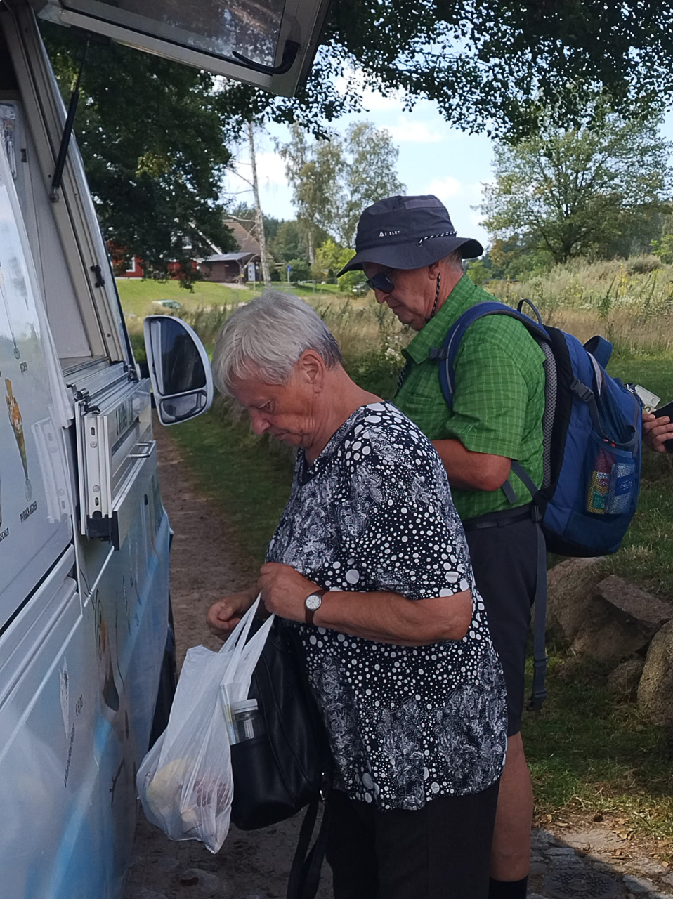 Im Schatten der Bäume gelangten wir schnell zur Rast am Franzosenweg bei Repente. Über eine sonnige Strecke gingen wir zur Brücke über den Repenter Kanal. Es folgten wieder schattigere Wege bis zur Badestelle am Ferienhauspark. Hier überraschte uns der Eismann und viele konnten seinem Ruf nicht widerstehen. Lecker!